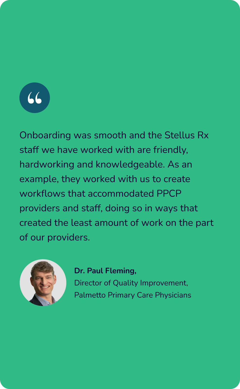 Onboarding was smooth and the Stellus Rx staff we have worked with are friendly, hardworking and knowledgeable. As an example, they worked with us to create workflows that accommodated PPCP providers and staff, doing so in ways that created the least amount of work on the part of our providers.