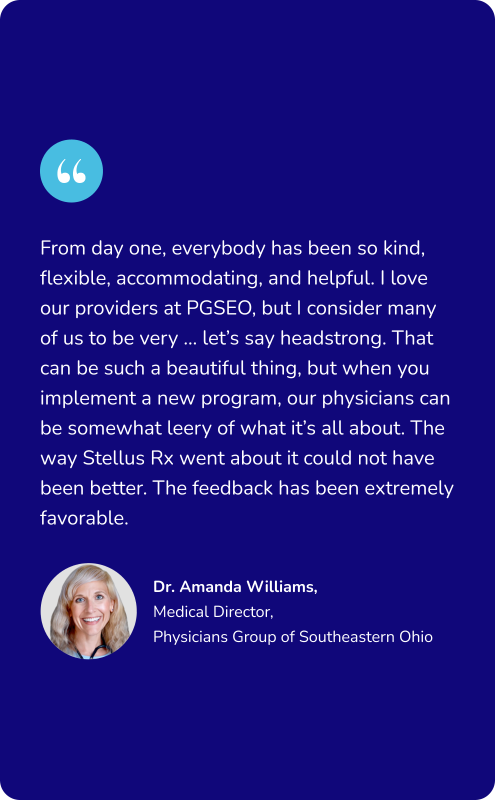 From day one, everybody has been so kind, flexible, accommodating, and helpful. I love our providers at PGSEO, but I consider many of us to be very … let’s say headstrong. That can be such a beautiful thing, but when you implement a new program, our physicians can be somewhat leery of what it’s all about. The way Stellus Rx went about it could not have been better. The feedback has been extremely favorable.