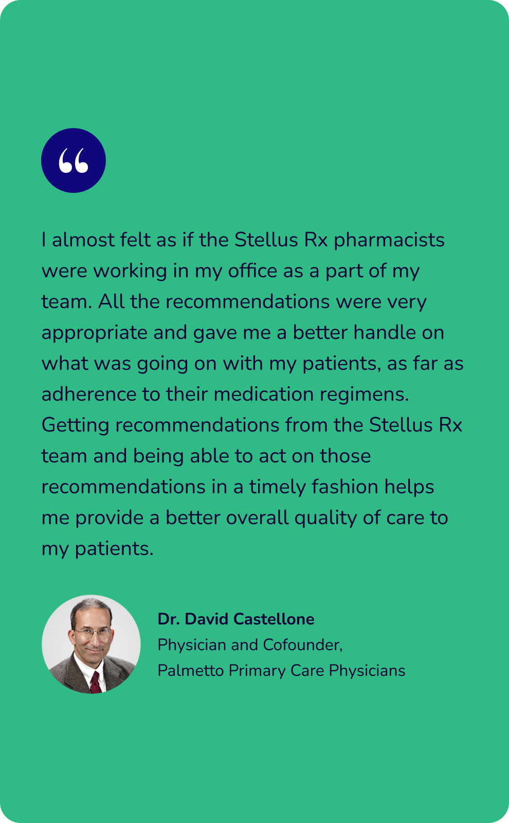 I almost felt as if the Stellus Rx pharmacists were working in my office as a part of my team. All the recommendations were very appropriate and gave me a better handle on what was going on with my patients, as far as adherence to their medication regimens. Getting recommendations from the Stellus Rx team and being able to act on those recommendations in a timely fashion helps me provide a better overall quality of care to my patients.