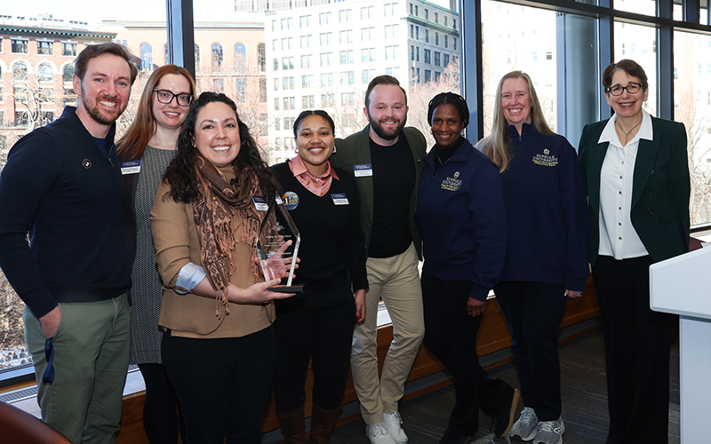 Members of the Center for First-Generation & Educational Equity (from left): Nicholas Charrette, Jenna Carpenter, Lisa Rivera, Tyrza Milord, Bryan Landgren, Ashley Booker, Jennifer Waden, and Suffolk President Marisa Kelly. Photography by Michael J. Clarke