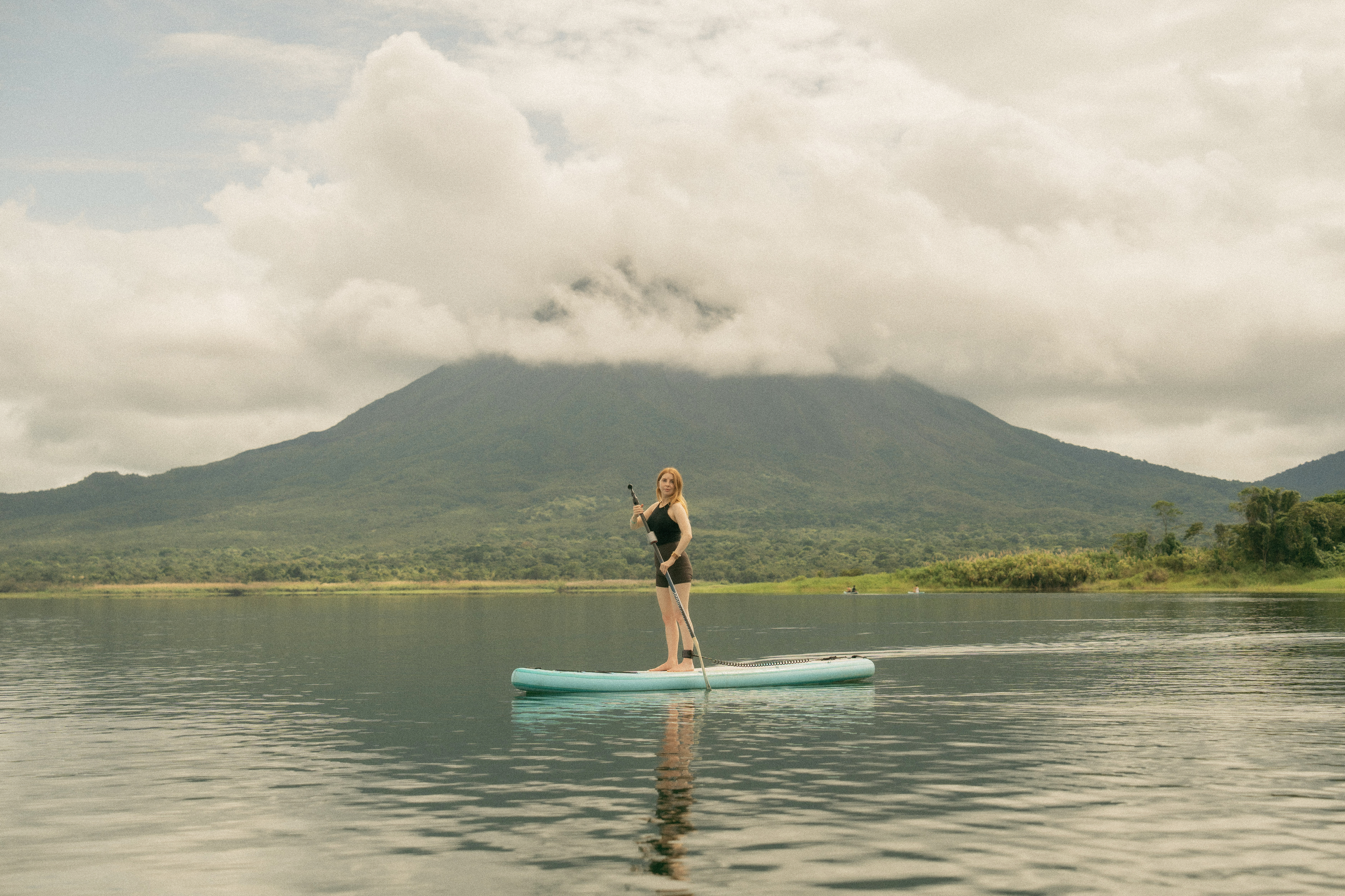 Taking in views of the volcano while paddle boarding on the glassy waters of Lake Arenal