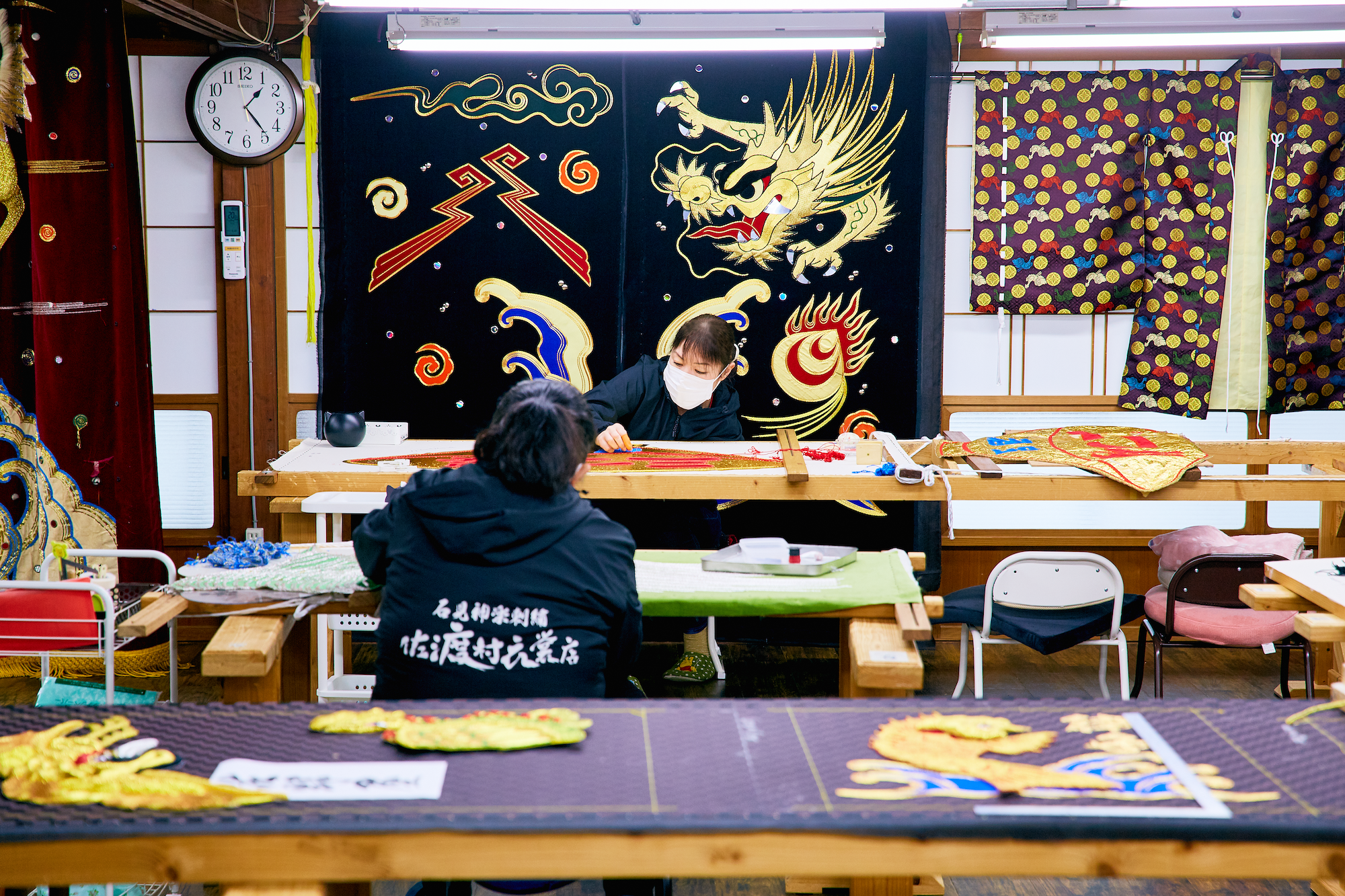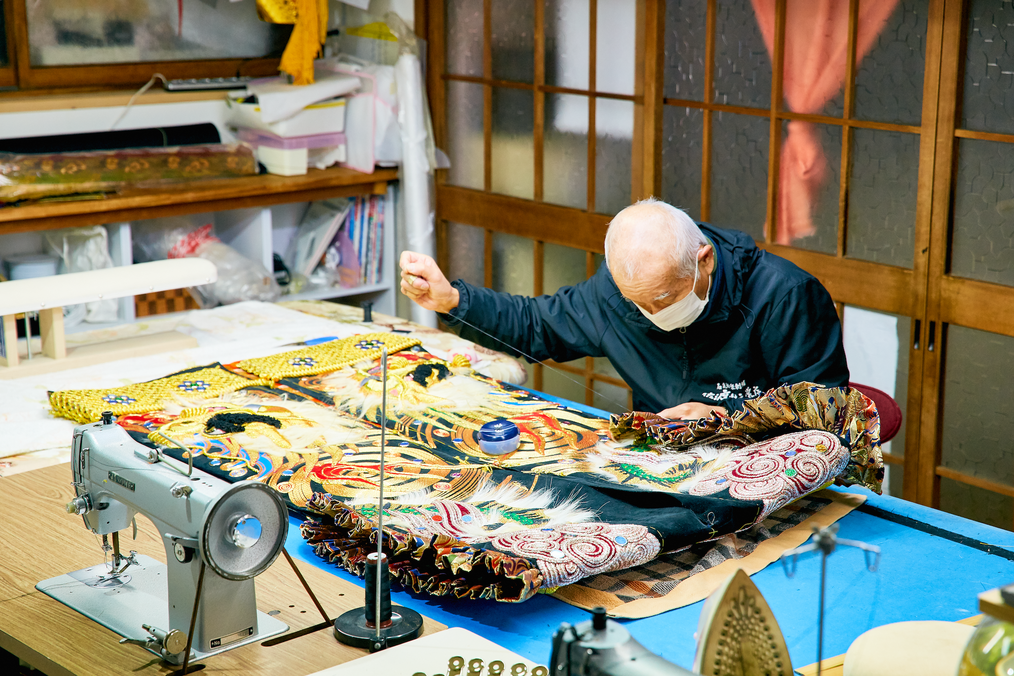 石見神楽の衣装は、金糸や銀糸を使った華やかさが