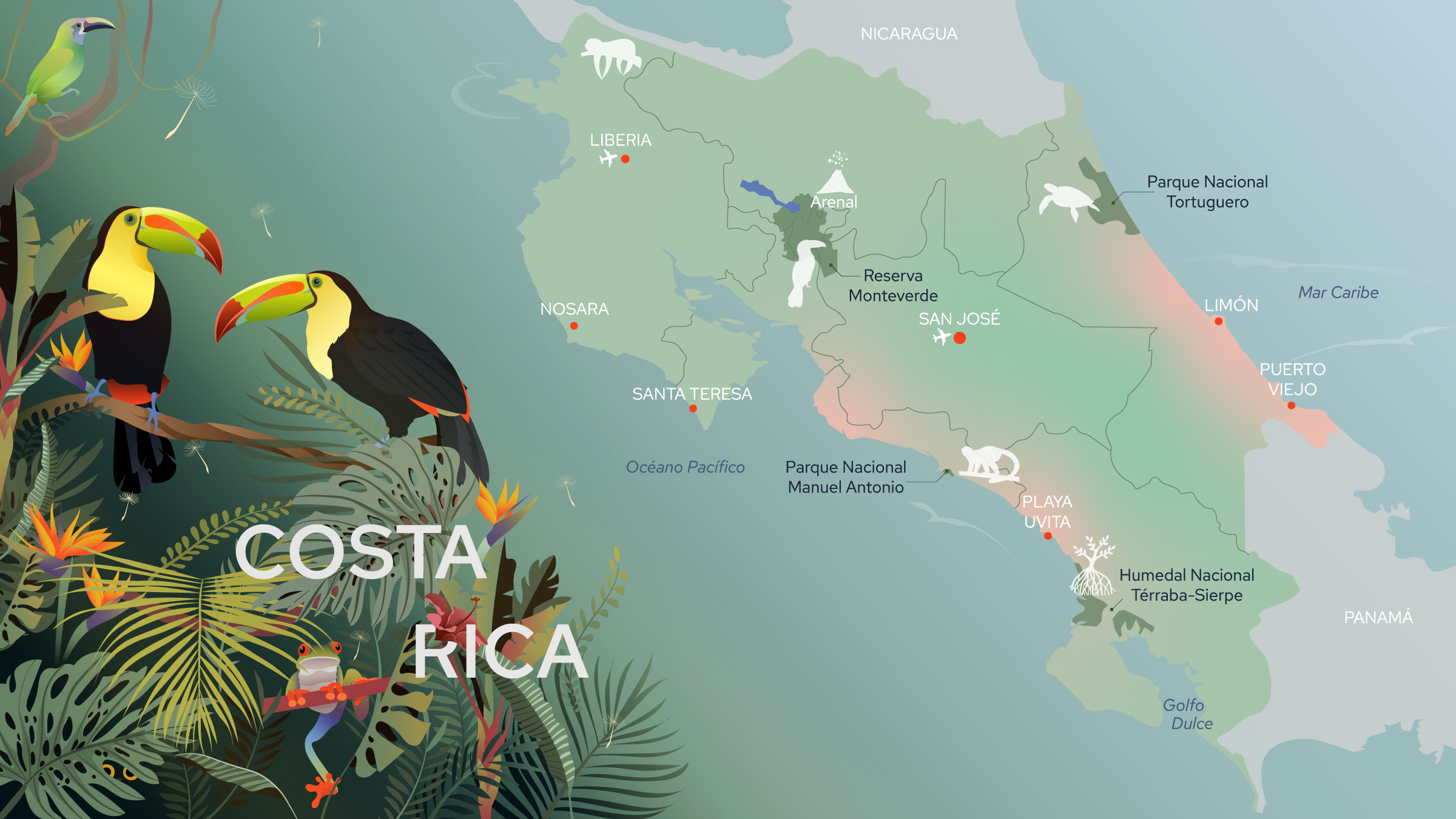 Costa Rica es un santuario natural donde la biodiversidad se manifiesta en cada rincón. Con el mar Caribe al este y el océano Pacífico al oeste, este pequeño país deslumbra con una riqueza ecológica sin igual. Selvas, volcanes, ríos caudalosos... casi el 59% del territorio nacional está cubierto por bosque. Además, más de una cuarta parte de su territorio está protegida por ley.