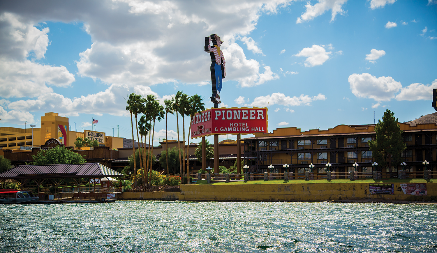 You can't miss The New Pioneer along the river, where the country Western style buildings and iconic cowboy sign welcome you to the property. It's home to a private beach, the Bumbleberry Flats restaurant and 24-hour gaming.