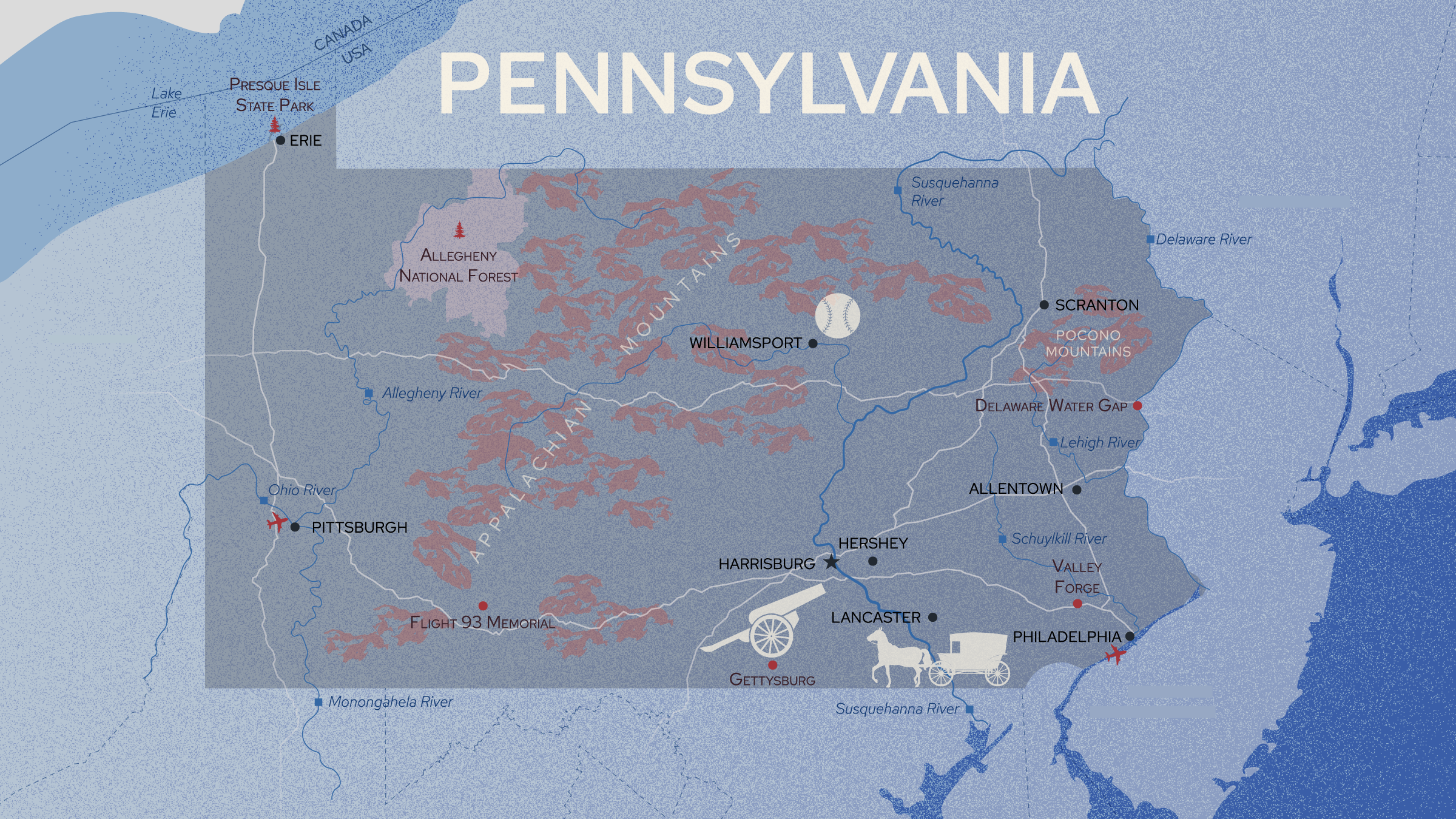 Pennsylvania's two largest cities—Philadelphia and Pittsburgh—anchor the eastern and western corners of the state. The two cities share a blue-collar work ethic, riverfront settings and rabid love of their sports teams. But they are also decidedly different.