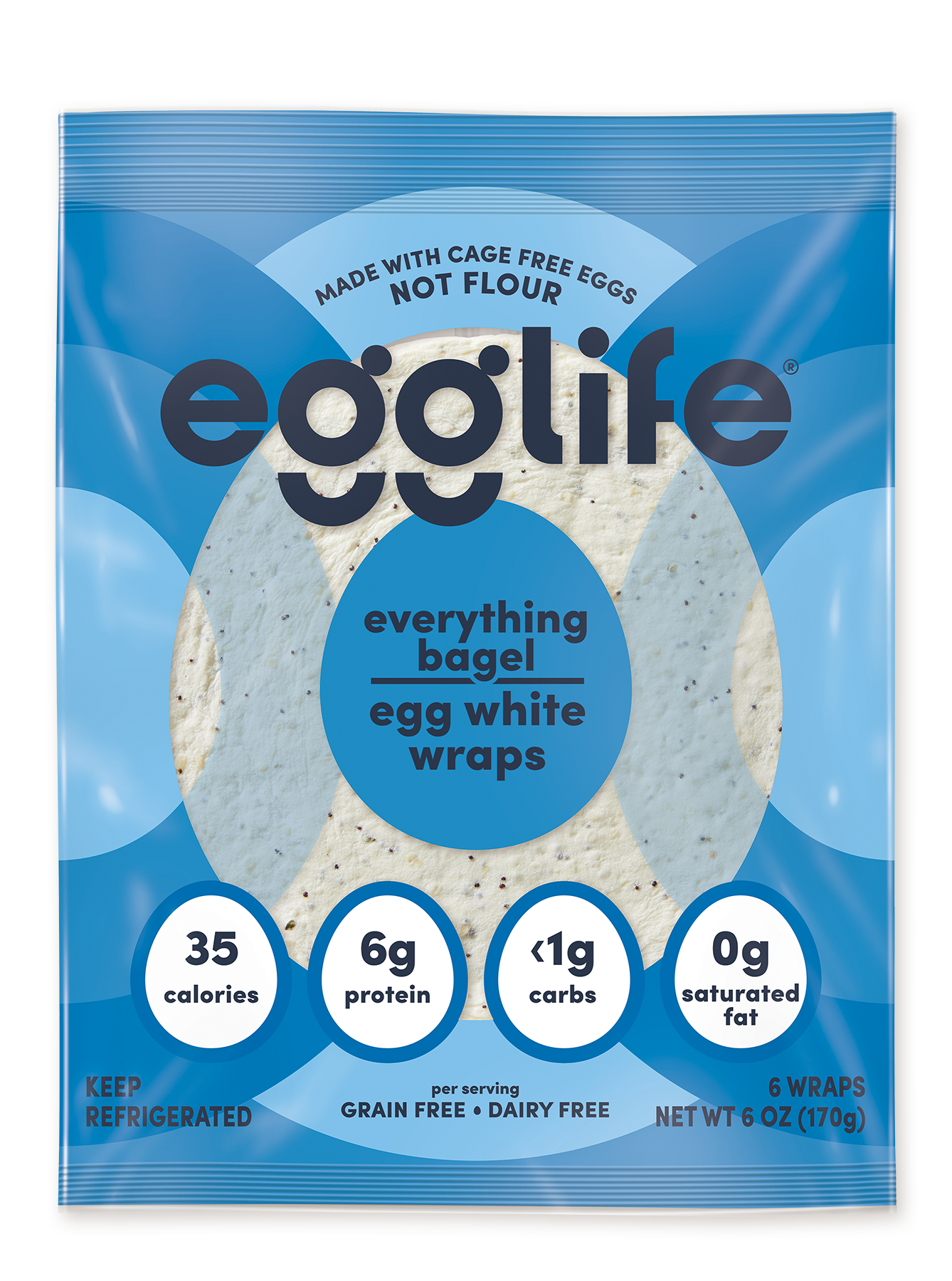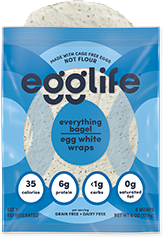 A high protein wrap with a bit of everything but extra carbs. Cage free egg whites, garlic, onion, poppy and hemp seeds, and sea salt make this low-carb tortilla-style wrap a winner. And with 6 grams of protein and just 35 calories, what’s not to love? All that’s missing is the schmear.