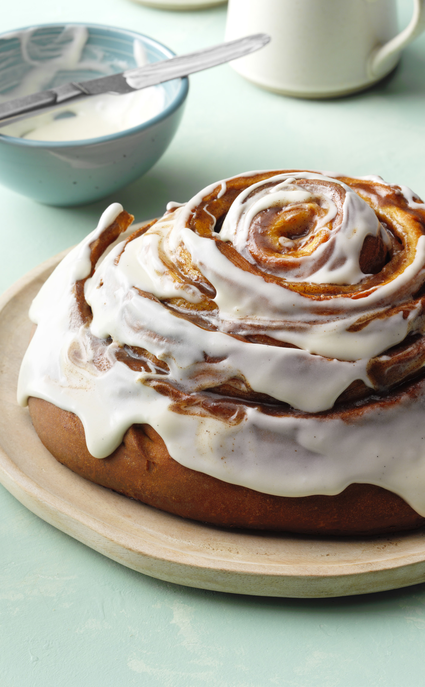 10. For the icing, in a small bowl using a KitchenAid Go™ Cordless System Hand Mixer, beat cream cheese and butter until blended; beat in vanilla and salt. Gradually beat in confectioners’ sugar until smooth, adding milk or cream if too thick. Spread over top of bread.