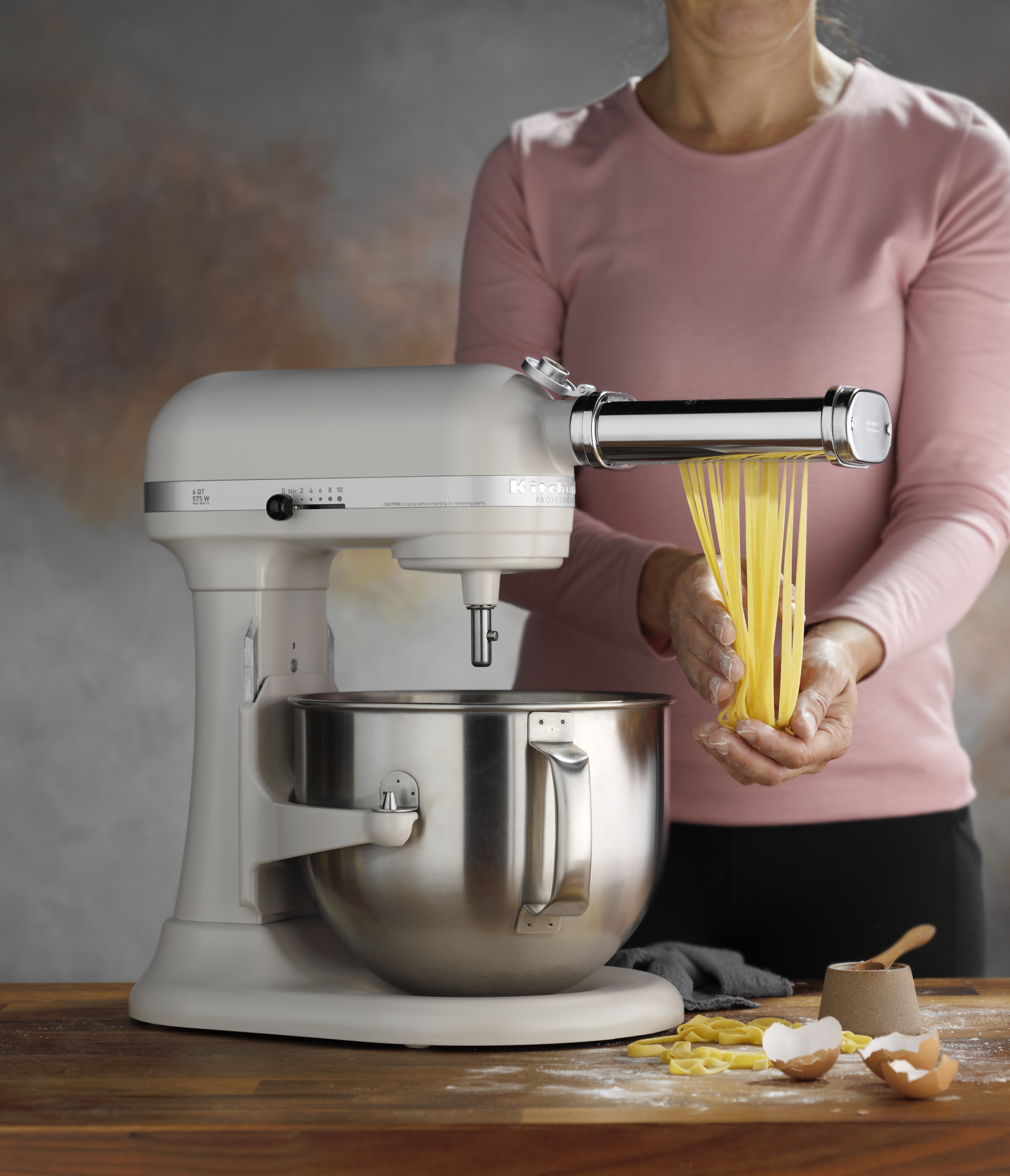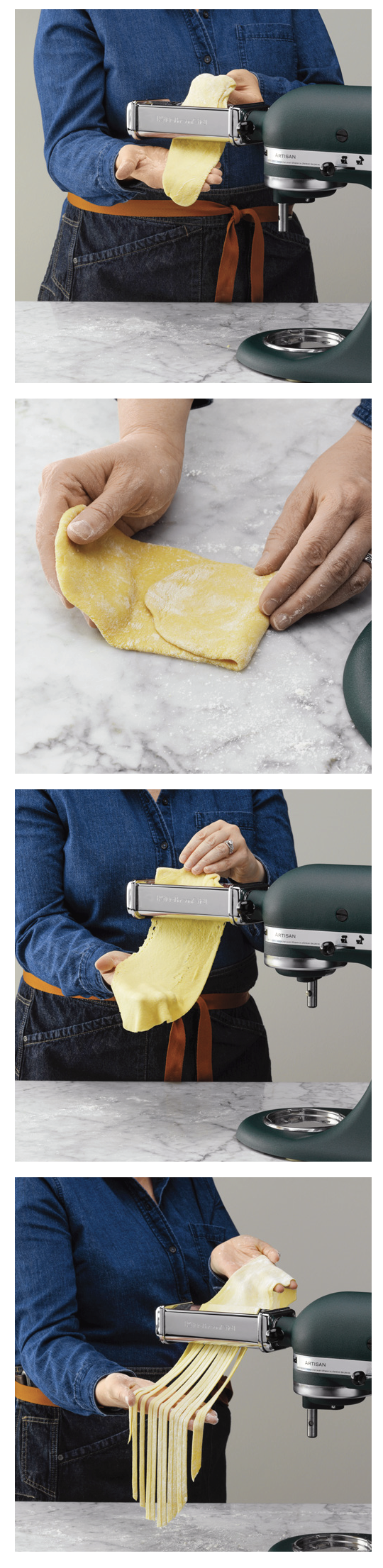 3. Working with 1 portion at a time (keep remaining portions covered), flatten the dough into a small rectangle, dusting with flour as needed. Using the KitchenAid® Bowl-Lift Stand Mixer with the Pasta Roller Attachment on the widest setting, feed the dough, short side first, into the roller. Fold the dough into thirds to form a rectangle. Feed the dough through a second time, then repeat another 3-4 times until smooth. Turn the dial to reduce the opening on the attachment; feed dough through 2 times. Repeat this, making the opening more narrow and rolling the dough twice at each setting, until you can see the outline of your hand through the dough (setting 6 or 7). Trim dough sheets to 11- to 13-in. pieces. Replace Pasta Roller with the Fettuccine Cutter Attachment. Feed the dough through to cut it into individual noodles. If needed, lightly dust noodles with flour to prevent the dough from sticking. Repeat with remaining dough. Cook in boiling water until al dente,