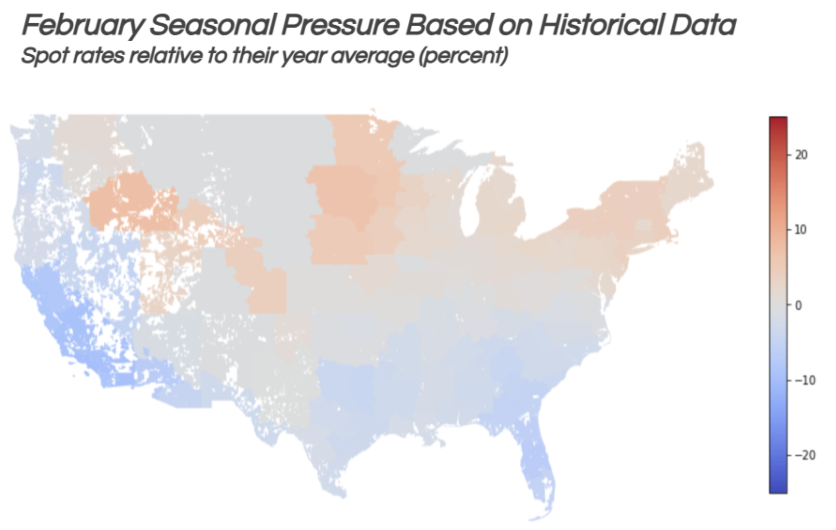 February typically marks a decline in spot market demand as the holiday rush subsides and drivers return to work. This usually results in spot rates falling below annual averages, with the exception of a few Midwest regions.