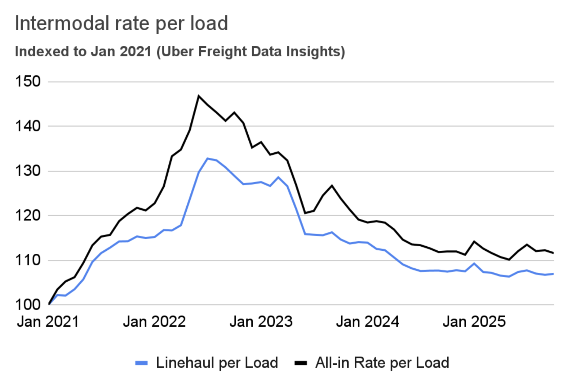 The intermodal linehaul rate per load edged up a mere 0.2% in October, yet it remains 0.5% lower year-over-year, according to Uber Freight’s data. However, falling fuel prices caused the all-in rate per load to decline slightly by 0.6%, leading to a $0.3 year-over-year drop. Intermodal rates continue to lag truckload contract rates, which have held flat for several quarters. As a result, we do not anticipate any significant movement in intermodal rates until truckload rates recover.