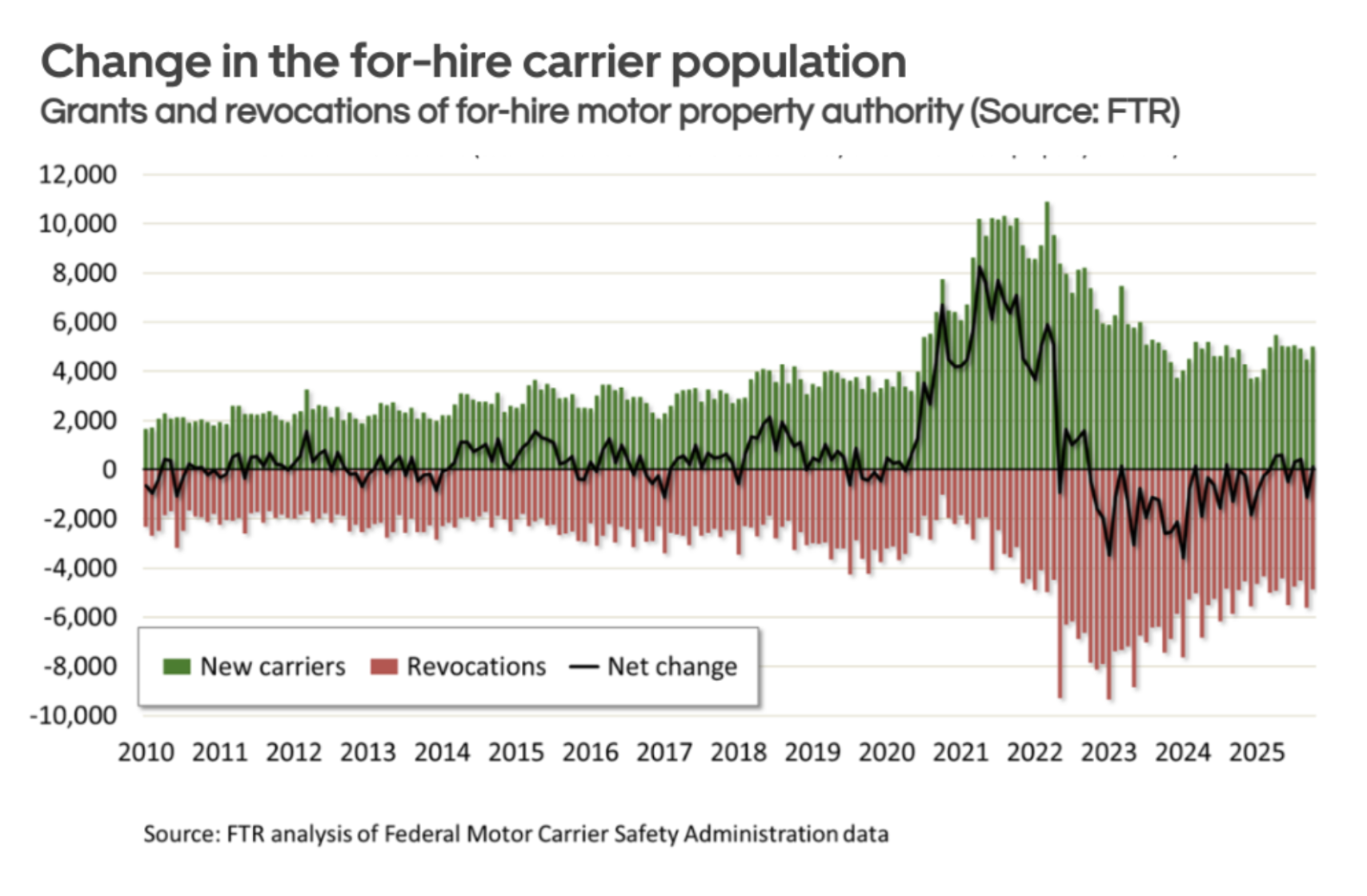 Additionally, the carrier population continues to shrink due to ongoing capacity reduction. FMCSA data indicates a net decrease of 385 carriers in Q3, following a modest increase of only 671 in Q2.