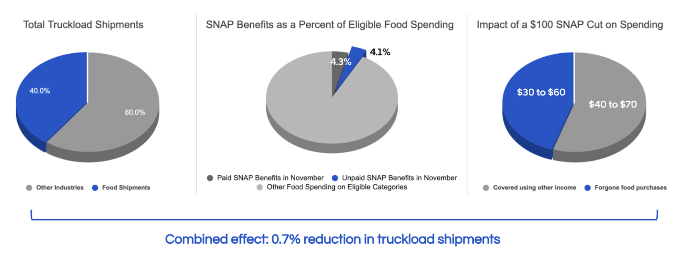 Due to the government shutdown, November SNAP payments are partially funded at $4.65 billion, down from the typical $8 billion. Food accounts for approximately 40% of U.S. truckload shipments, and a $100 SNAP cut typically correlates to a $30–$60 drop in food spending. Therefore, reduced SNAP benefits are projected to result in a 0.7% decline in U.S. truckload volumes.