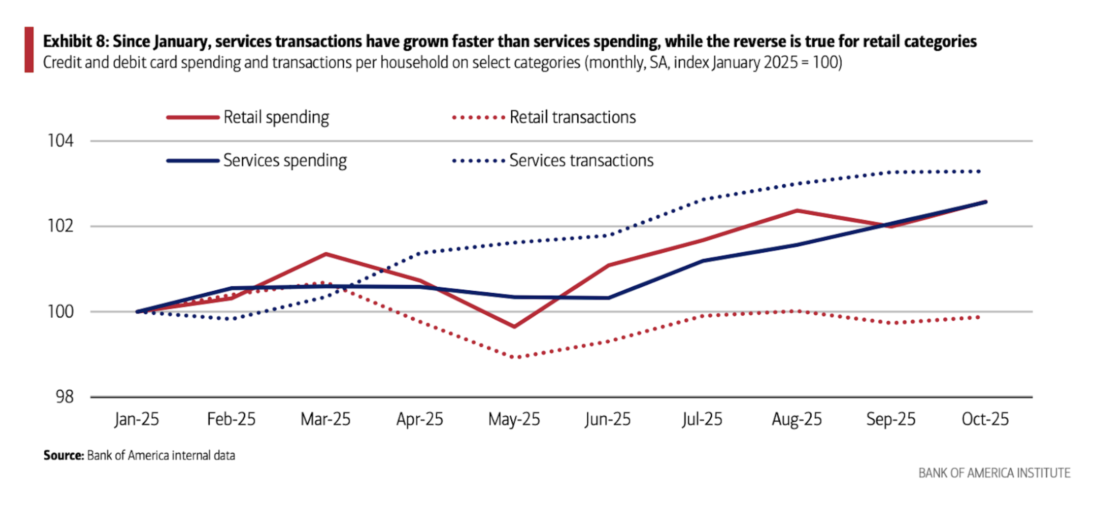 This shift is supported by Bank of America Institute Consumer Checkpoint data, which shows that while total retail spending has increased over the past year, the number of retail transactions has decreased, indicating a higher average cost per purchase.
