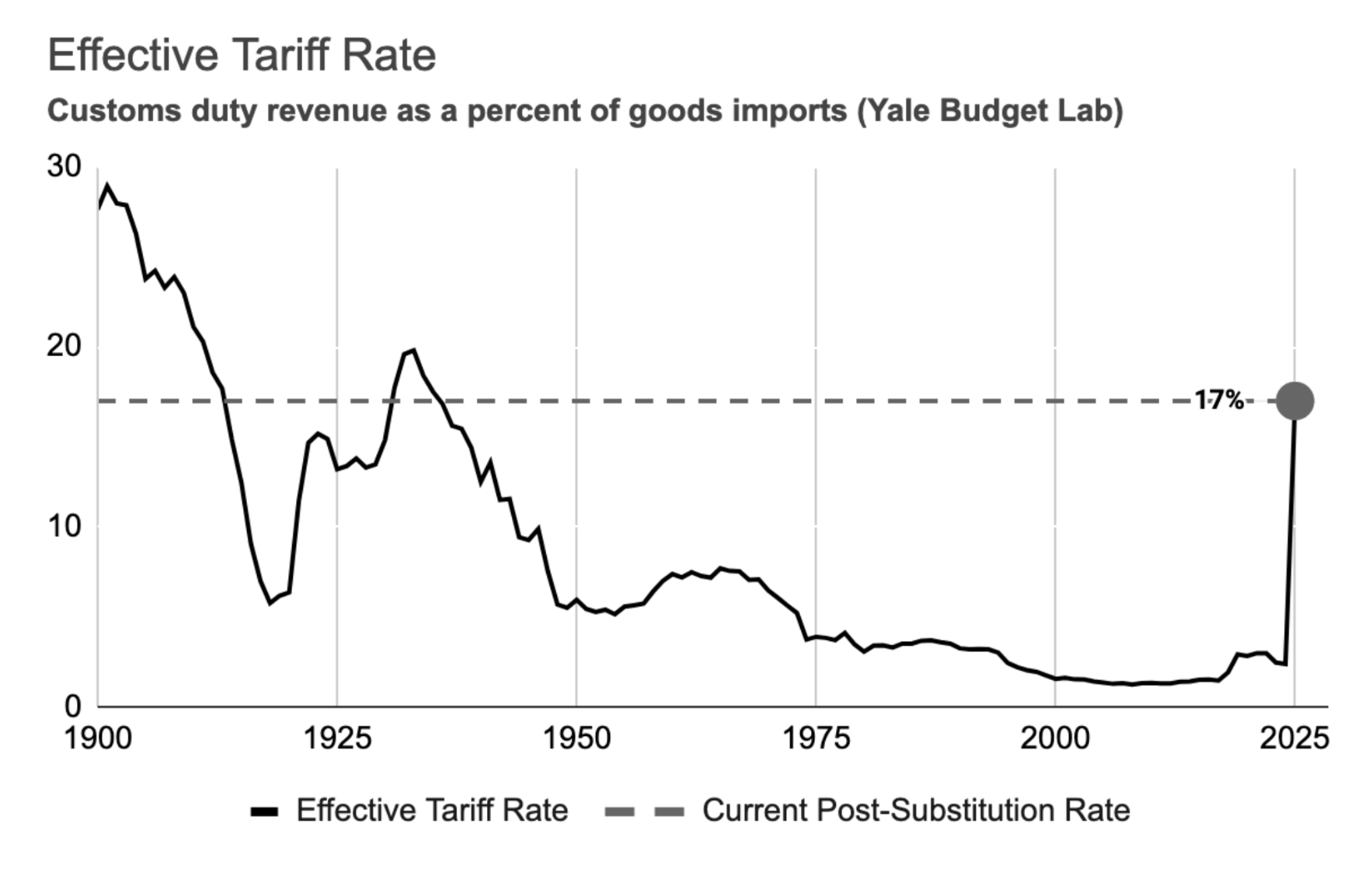 The average effective tariff rate reached 17% in October, the highest level since 1936, according to the Yale Budget Lab. This is expected to increase consumer prices by 1.3%, resulting in an average annual loss of $1,800 per household. The tariffs disproportionately impact clothing, footwear, autos, electrical equipment, manufacturing commodities (metals and minerals), and machinery.