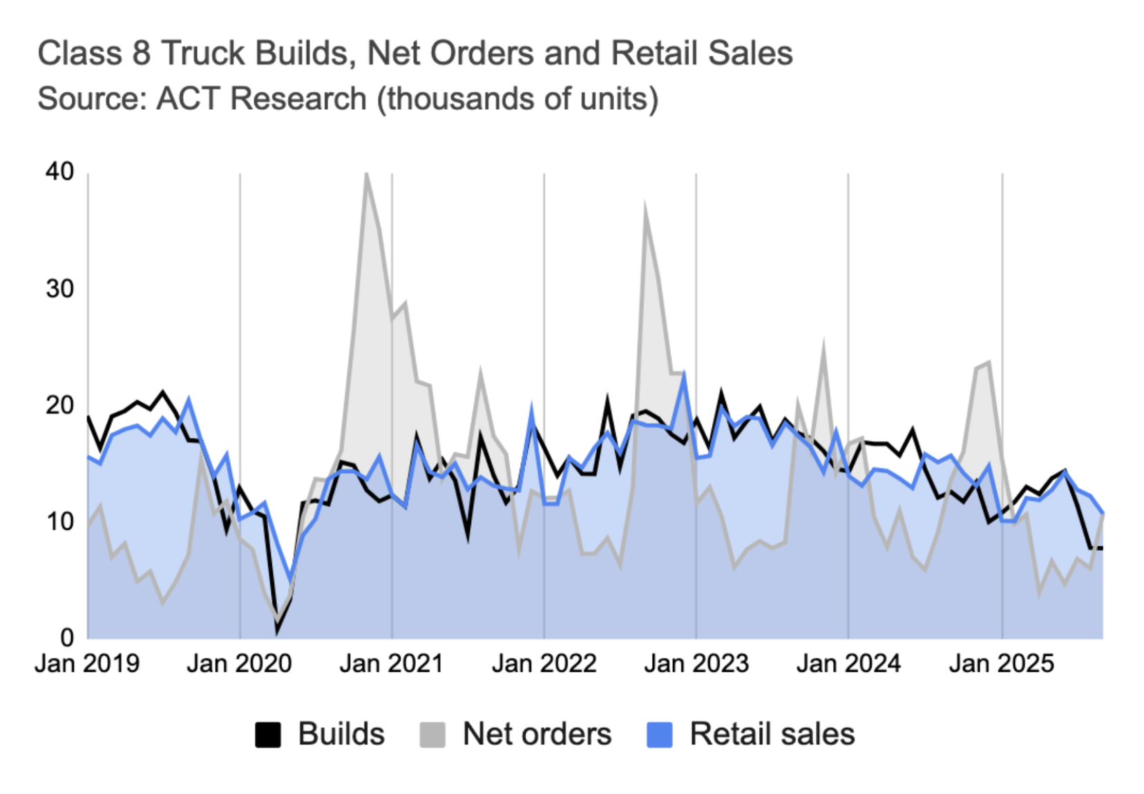 Amid a prolonged freight recession and tariff uncertainty, carriers remain cautious, keeping tractor orders low. This market slump, which sees current tractor orders near a five-year low, has been compounded by President Trump's imposed 25% tariff on medium- and heavy-duty trucks, which primarily impacts imports from Mexico. In the current peak ordering season, year-over-year declines stand at 21% for Class 8 tractor orders, 32% for sales, and 38% for production, according to ACT Research.