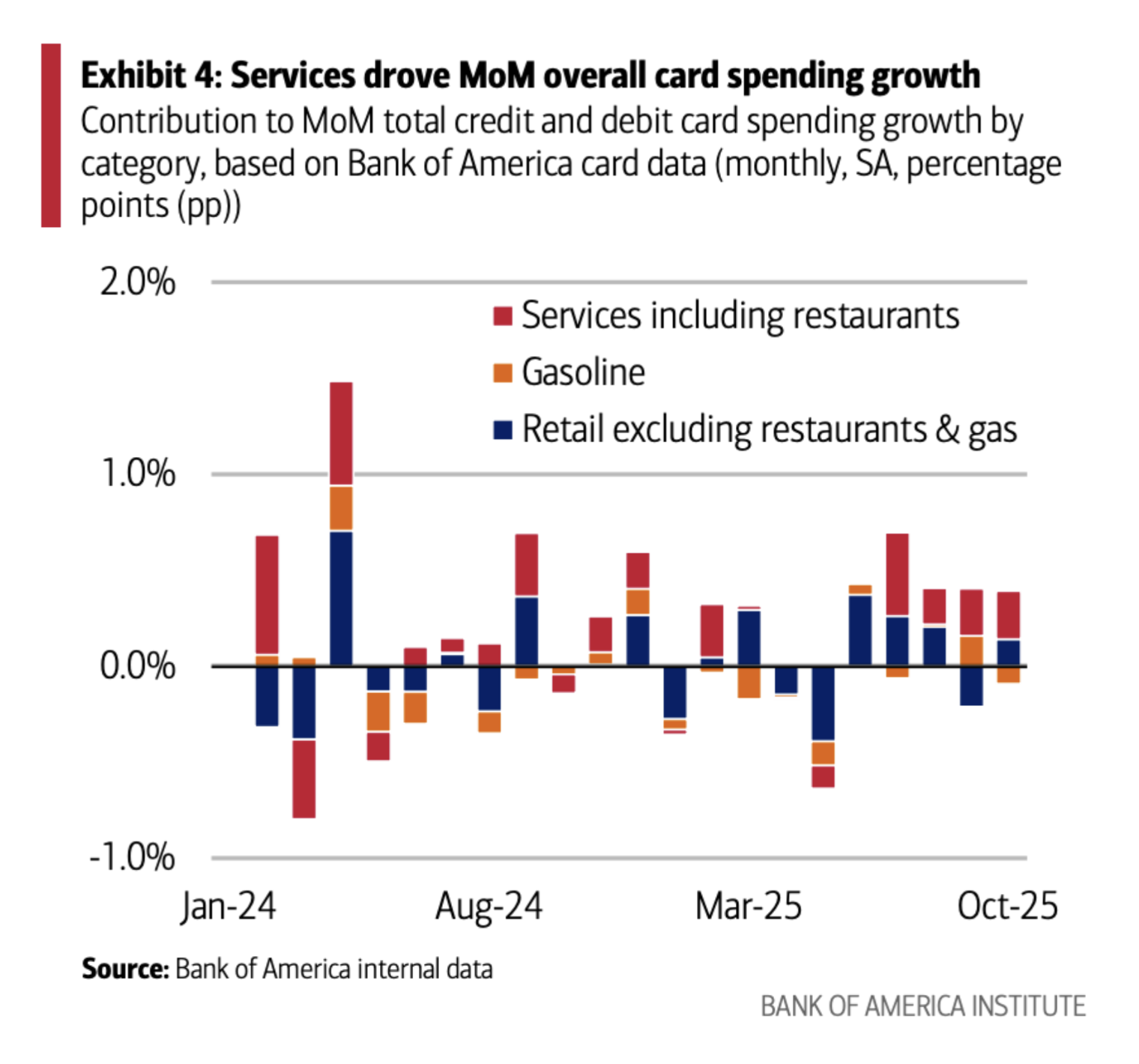 Despite a lack of full visibility into key economic indicators due to the government shutdown—particularly those measuring consumer spending—external data suggests little cause for alarm. The Bank of America Institute Consumer Checkpoint, for example, reports solid consumer spending, with seasonally adjusted credit card spending per household growing 0.3% month-over-month (MoM), marking a fifth consecutive monthly increase. Year-over-year spending on "holiday items" also remained healthy through the end of October, with average daily spending up nearly 5.7% YoY.