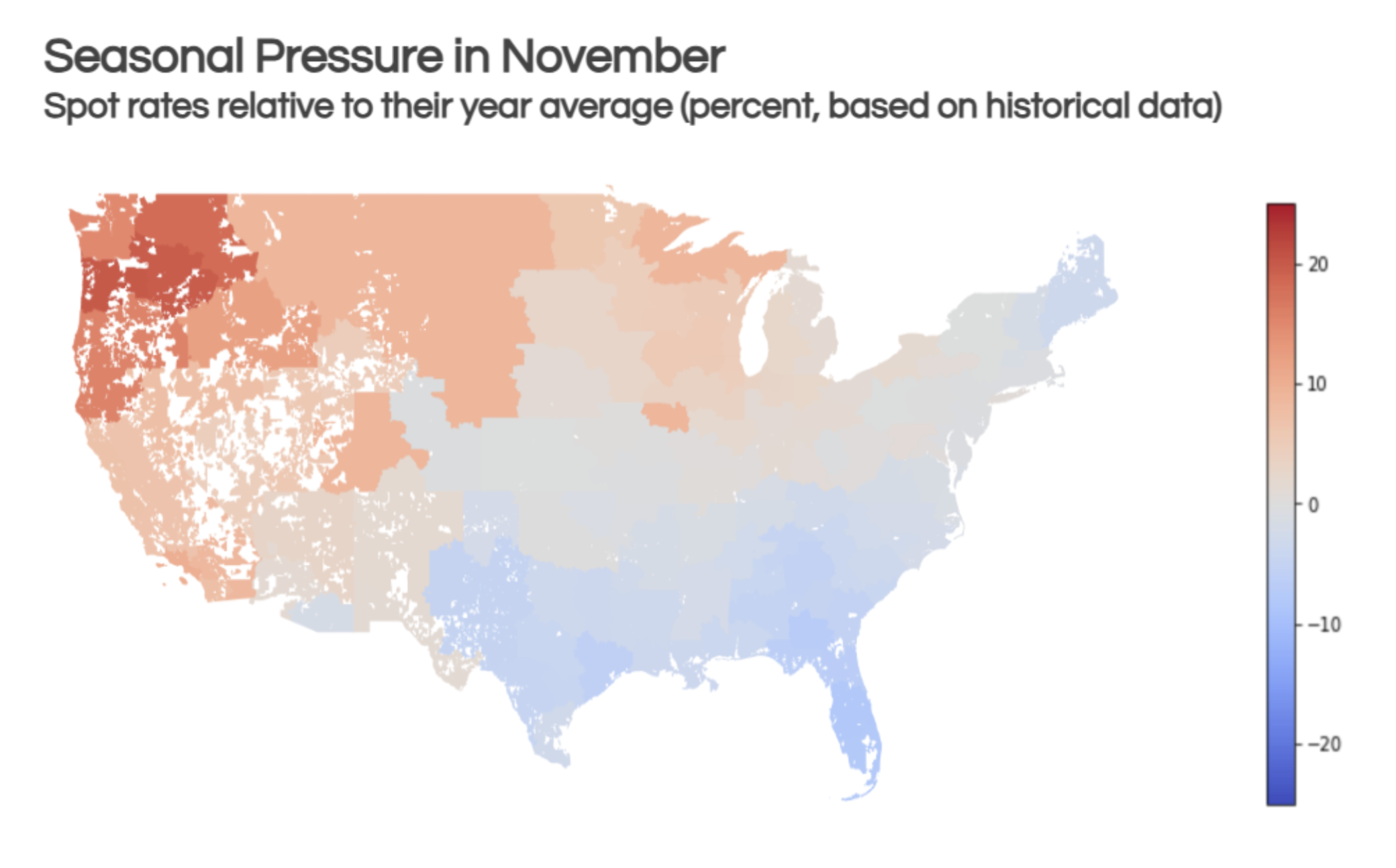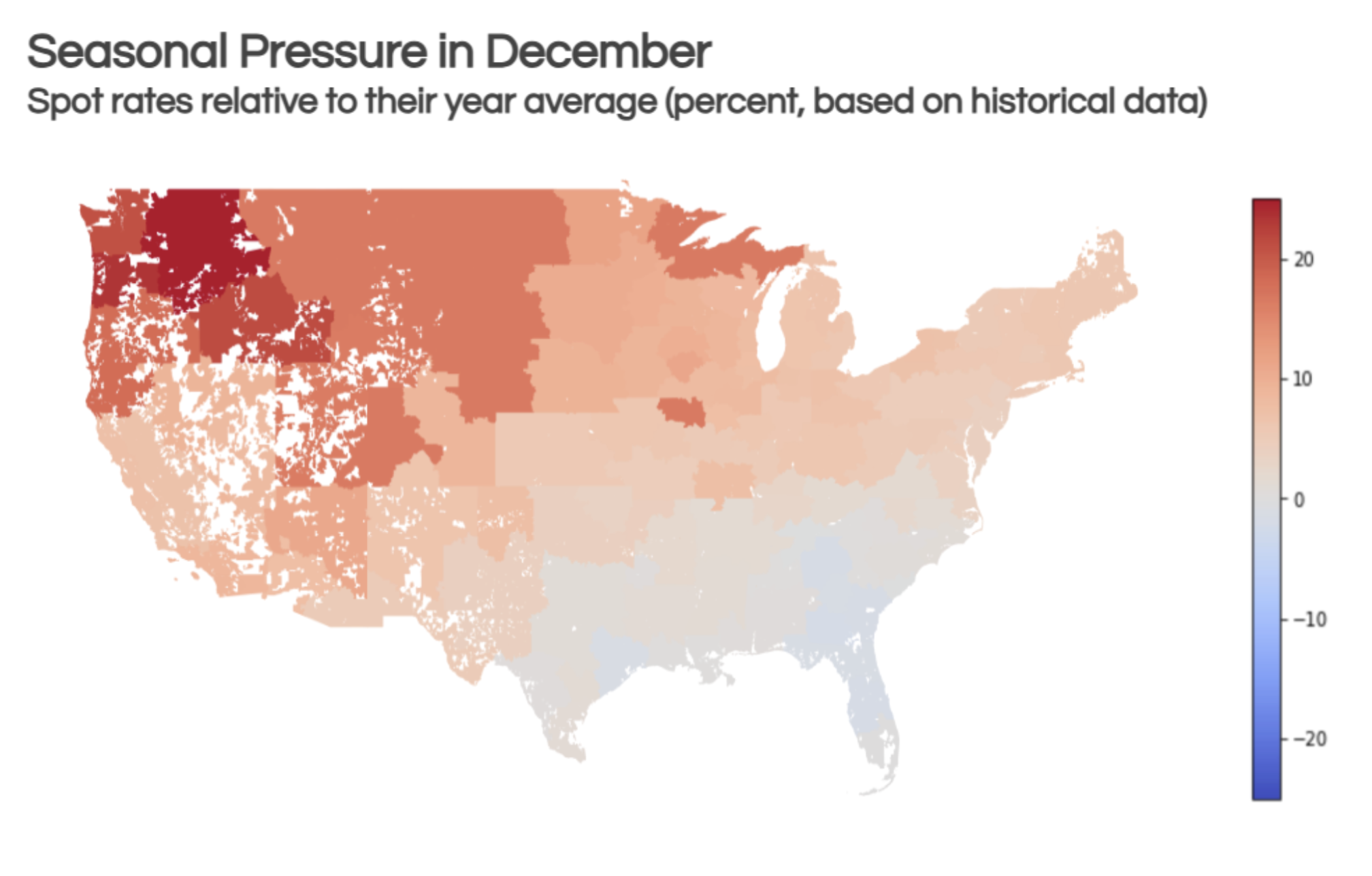 By December, the market tightens significantly across most regions, with the exception of the Southeast. Typically, spot rates in December are 5% higher than their yearly average. The Pacific Northwest is expected to experience the most severe tightness, with some markets seeing spot rate increases exceeding 20%.