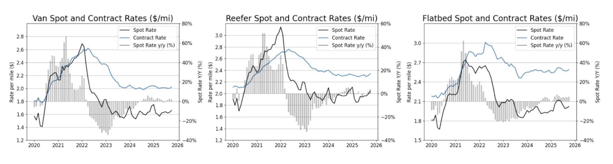 The spot market saw greater-than-expected tightening in October. Month-over-month, spot rates increased across all trailer types: dry van rose 1.8%, reefer jumped 2.5%, and flatbed climbed 1.0%. Contract rates also trended upward, with van up 1.0%, reefer increasing 1.3%, and flatbed rising 0.8%.
