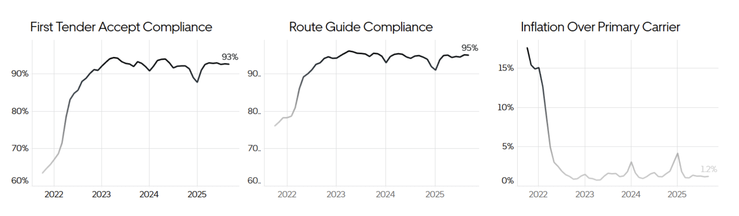 Route guide performance remained robust in October. The average First Tender Acceptance Rate remained unchanged at 93%, and Route Guide Compliance held at 95%. Tender rejections are resulting in a slight cost increase of 1.4% over the primary carrier, up from 1.2% in September. This marginal increase indicates that route guide failure remains de-risked.