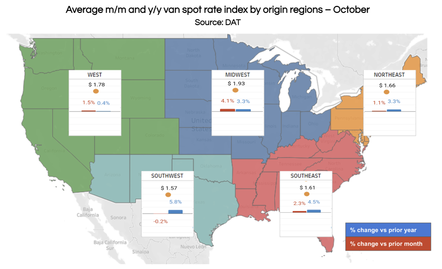 Spot rates increased across all regions in October, with the Southwest being the sole exception, experiencing a 0.2% month-over-month decline. While the gains in the West, Midwest, and Northeast were seasonally anticipated, the 2.3% jump in the Southeast was counter-seasonal. On a year-over-year basis, rates were higher across the board; the Southwest saw the largest increase (5.8% YoY), while the West posted the smallest (0.4% YoY), partially due to weaker imports following tariff disruptions.
