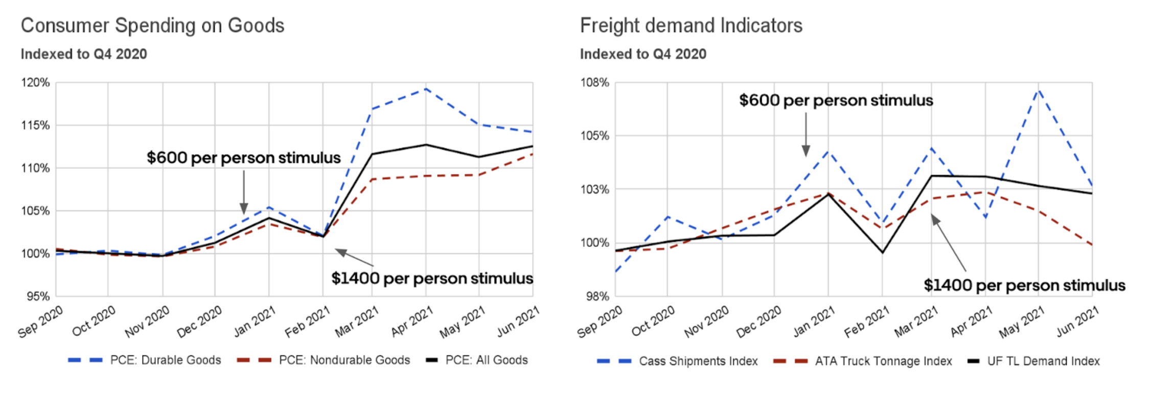 • Consolidated Appropriations Act ($600 per person): This bill led to a goods spending spike of approximately 3% to 5% above Q4 2020 levels in January 2021. Durable goods spending surged more than non-durables. Freight indicators showed corresponding increases: the Uber Freight Truckload Demand Index and the ATA Tonnage Index both rose by 3% above Q4 2020 in January, while the Cass Shipments Index surged by 5%.