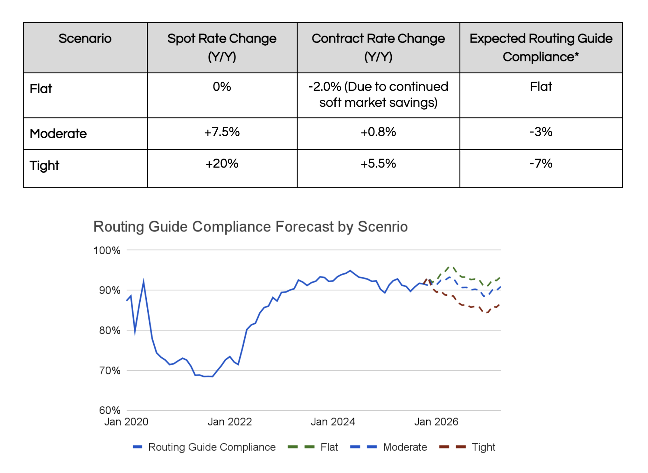 Utilizing our extensive dataset—which includes $20 billion in Freight Under Management, data from hundreds of carriers and shippers, and millions of truckload shipments—we developed forecasts for contract rates and routing guide compliance under each scenario: