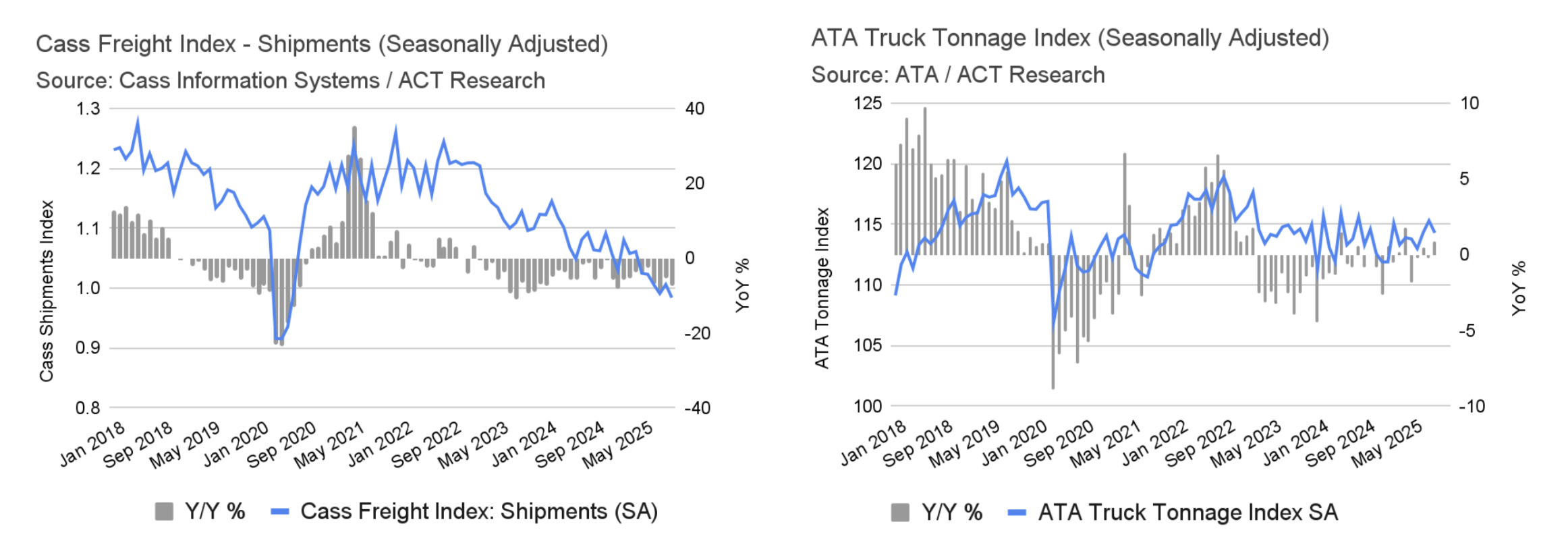 The Cass Freight Index shipments index fell sharply in October, dropping 4.3% month-over-month and accelerating the year-over-year decline to 7.8%. This weakness is concentrated in Less-Than-Truckload (LTL) freight because shippers are consolidating smaller loads into larger truckloads, according to ACT Research. Similarly, the American Trucking Associations’ Truck Tonnage Index saw a 0.9% decline in September, reaching its lowest level in three months. Despite this, overall tonnage levels are up 2.1% since the low point recorded in January, and up 0.8% compared to September 2024.