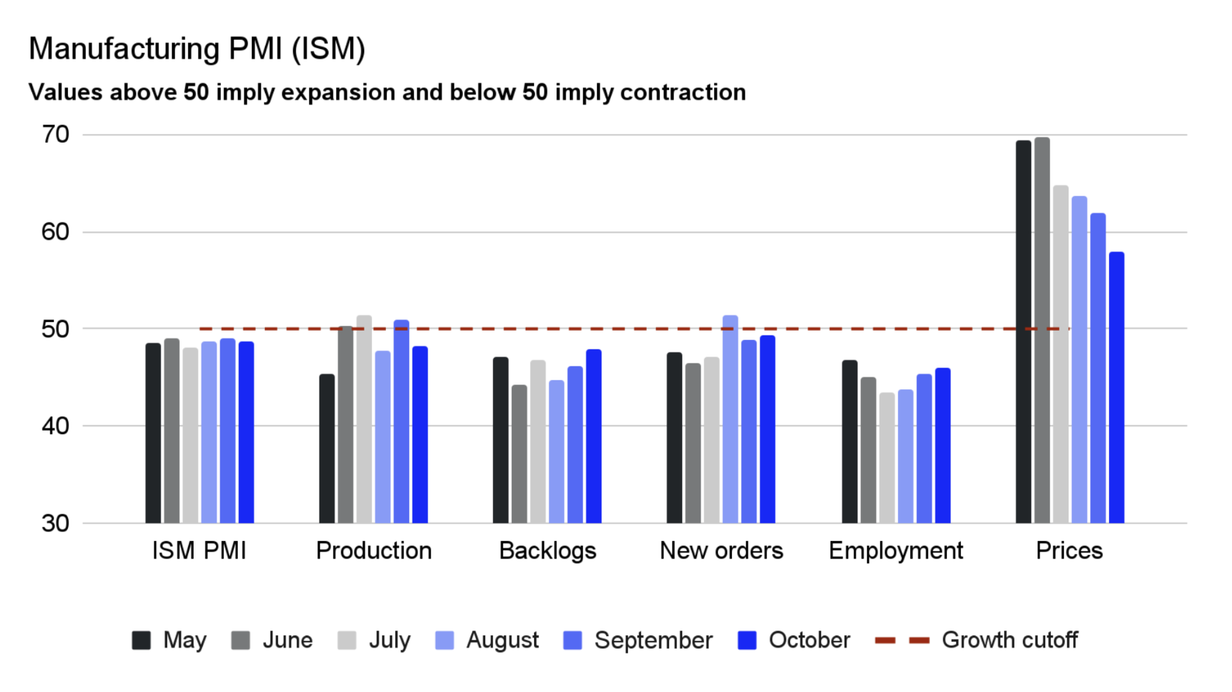 The Institute for Supply Management Purchasing Managers Index (ISM PMI) fell slightly to 48.7 in October, remaining below the 50.0 expansion threshold and indicating a continued, albeit moderate, contraction in the manufacturing sector. Forward-looking indicators such as New Orders and Backlogs also stayed under 50.0. However, their sequential rise hints that manufacturing activity may be approaching a bottom in the near future. The Prices Index decreased to 58, signaling a deceleration of inflation in the cost of commodities and raw materials.