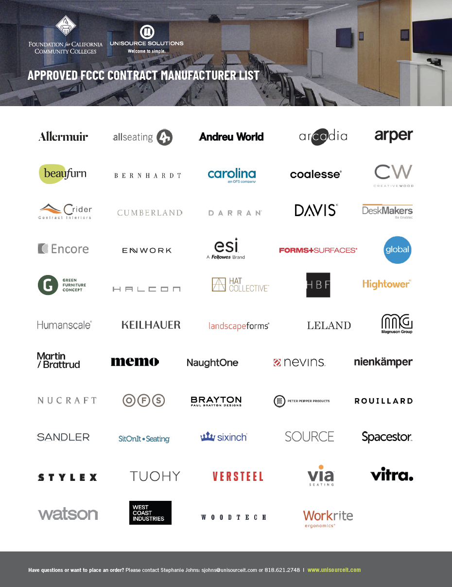 Hi there! My name is Stephanie Johns, I work for Unisource Solutions under the Foundation for California Community Colleges. Unisource Solutions alongside FCCC are working together to pilot a new program to help support California community colleges and their students to aggregate buying by providing one source for an easy-to-use expert for furniture, ergonomics, ancillary solutions, and services for your facilities – together we are a team who do not need to go to bid!