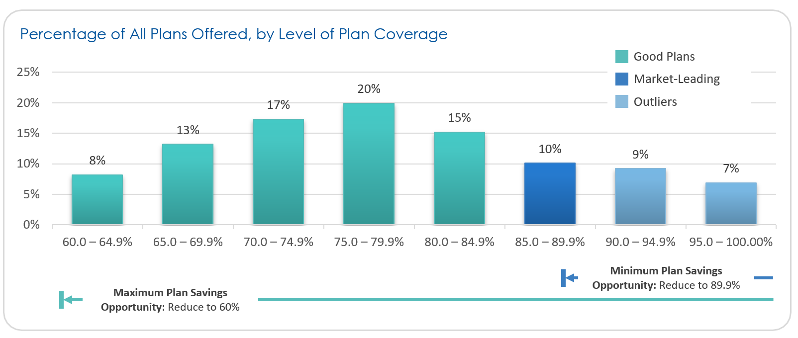 Many employers want to offer market-leading plans without being an outlier — only 10% of plans offered fall within the market-leading range, with an actuarial value (AV) between 85% and 90%.