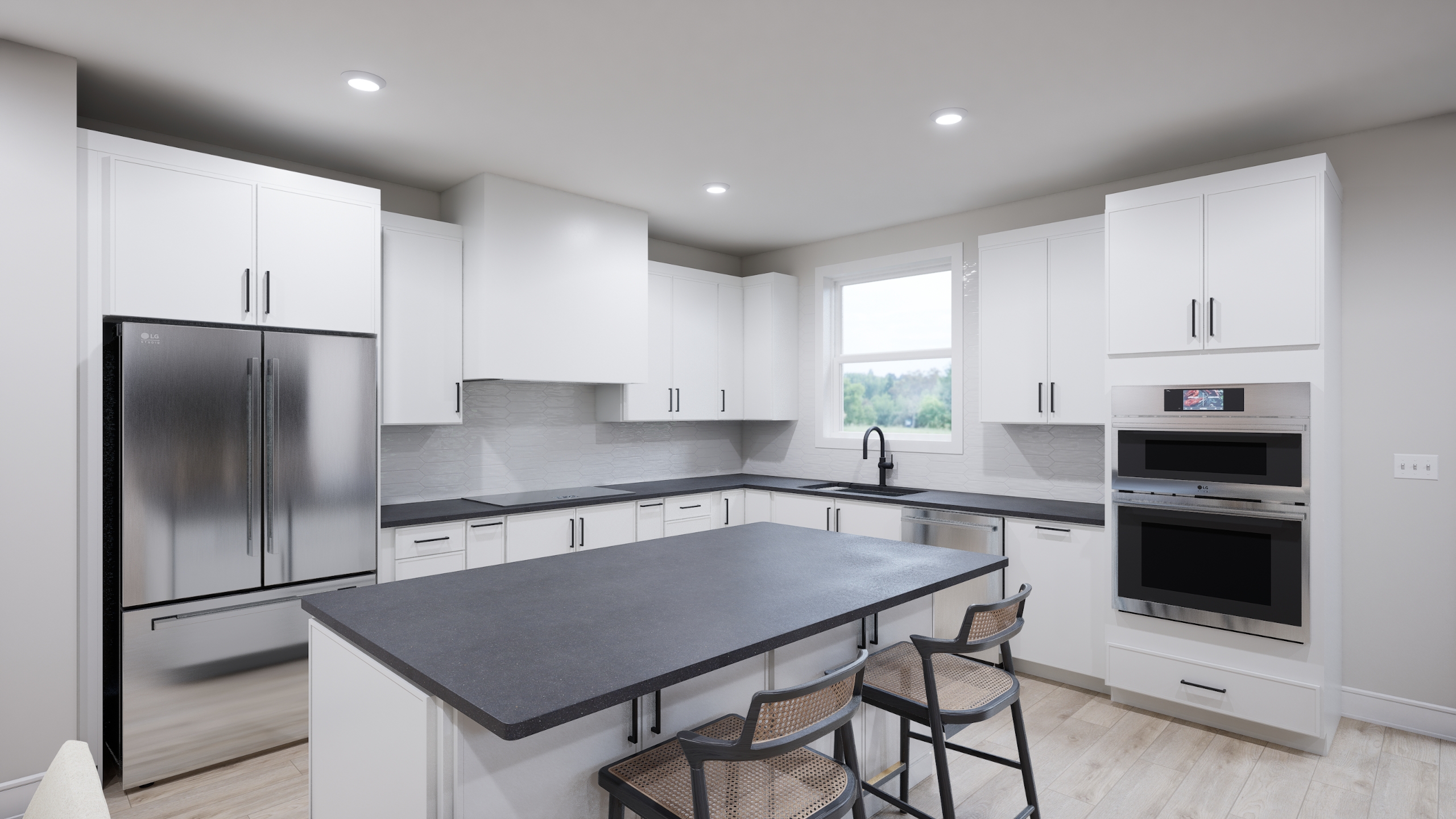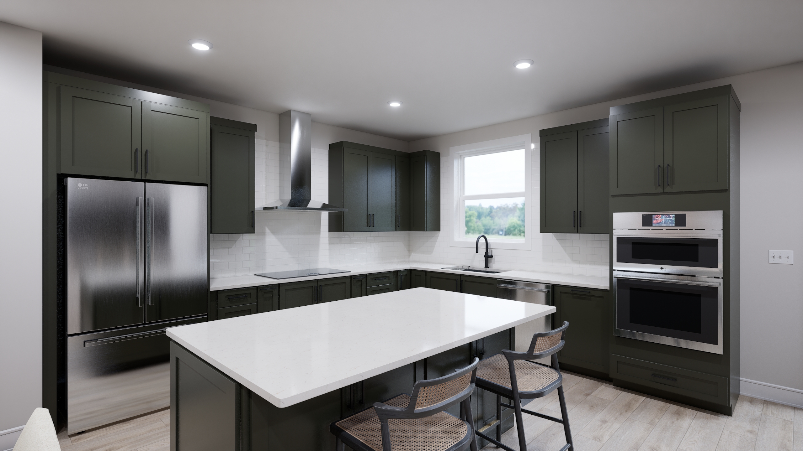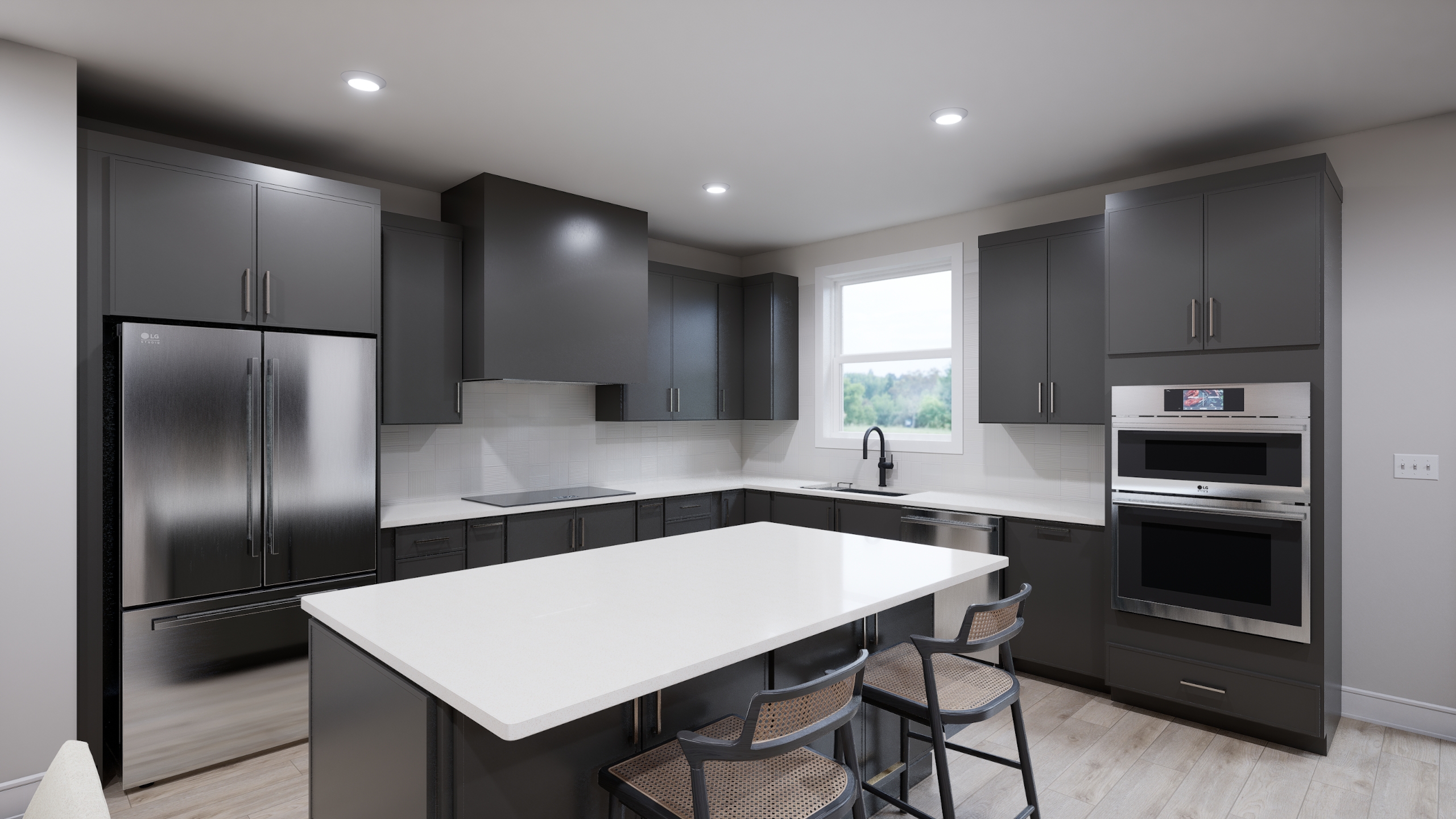 LG STUDIO appliances with wood hood
