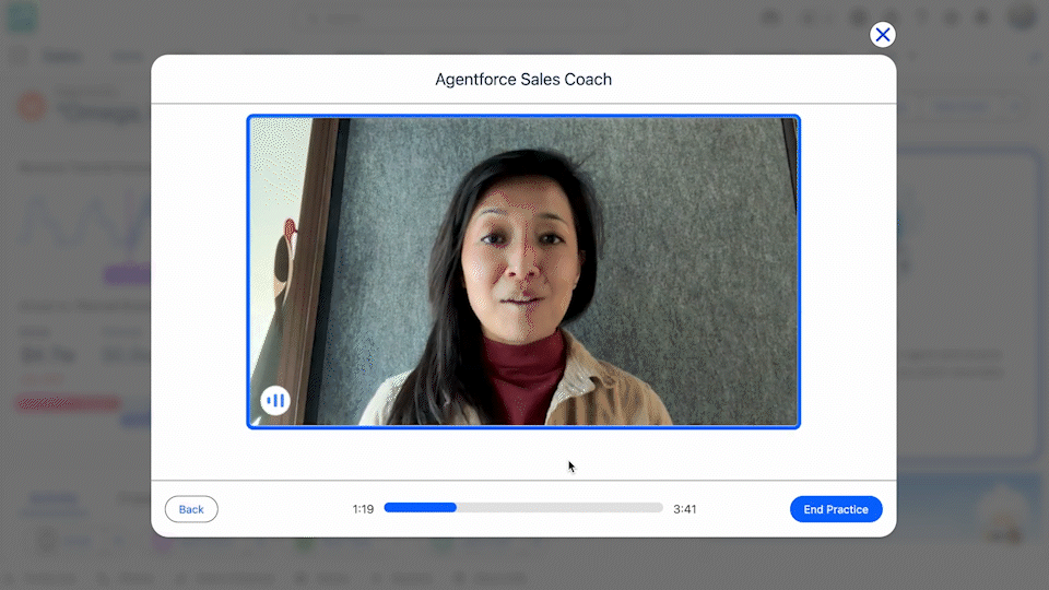 After the call, Alex turns to Agentforce Sales Coach for real-time, coaching in Salesforce. Instead of ad hoc feedback, Alex gets consistent, data-driven guidance with tailored insights and practice scenarios — helping refine pitches and strengthen performance.