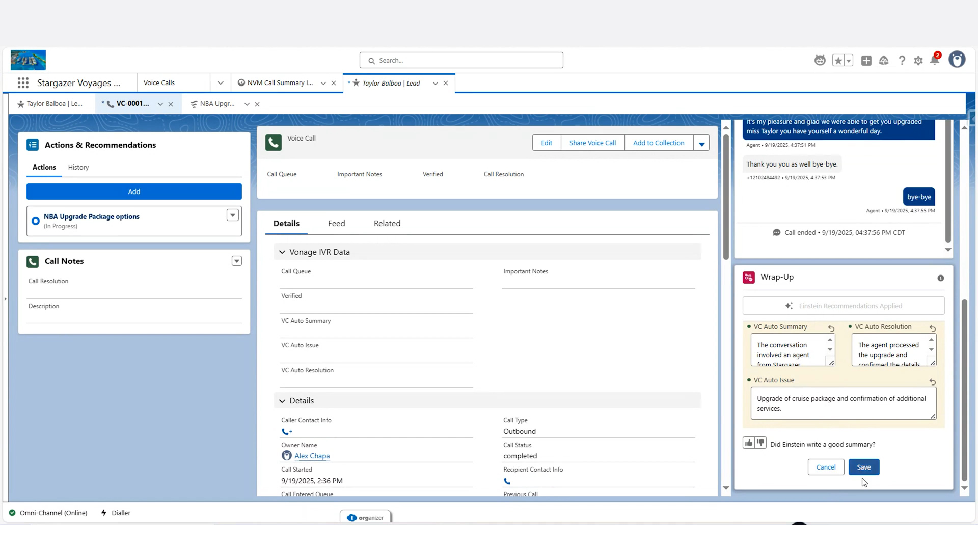 Using Agentforce to create a personalized script, Alex delivers tailored recommendations that increase the chance of earning Taylor’s business. With the Salesforce-embedded dialer, he also has instant access to account history and context, enabling smarter conversations.