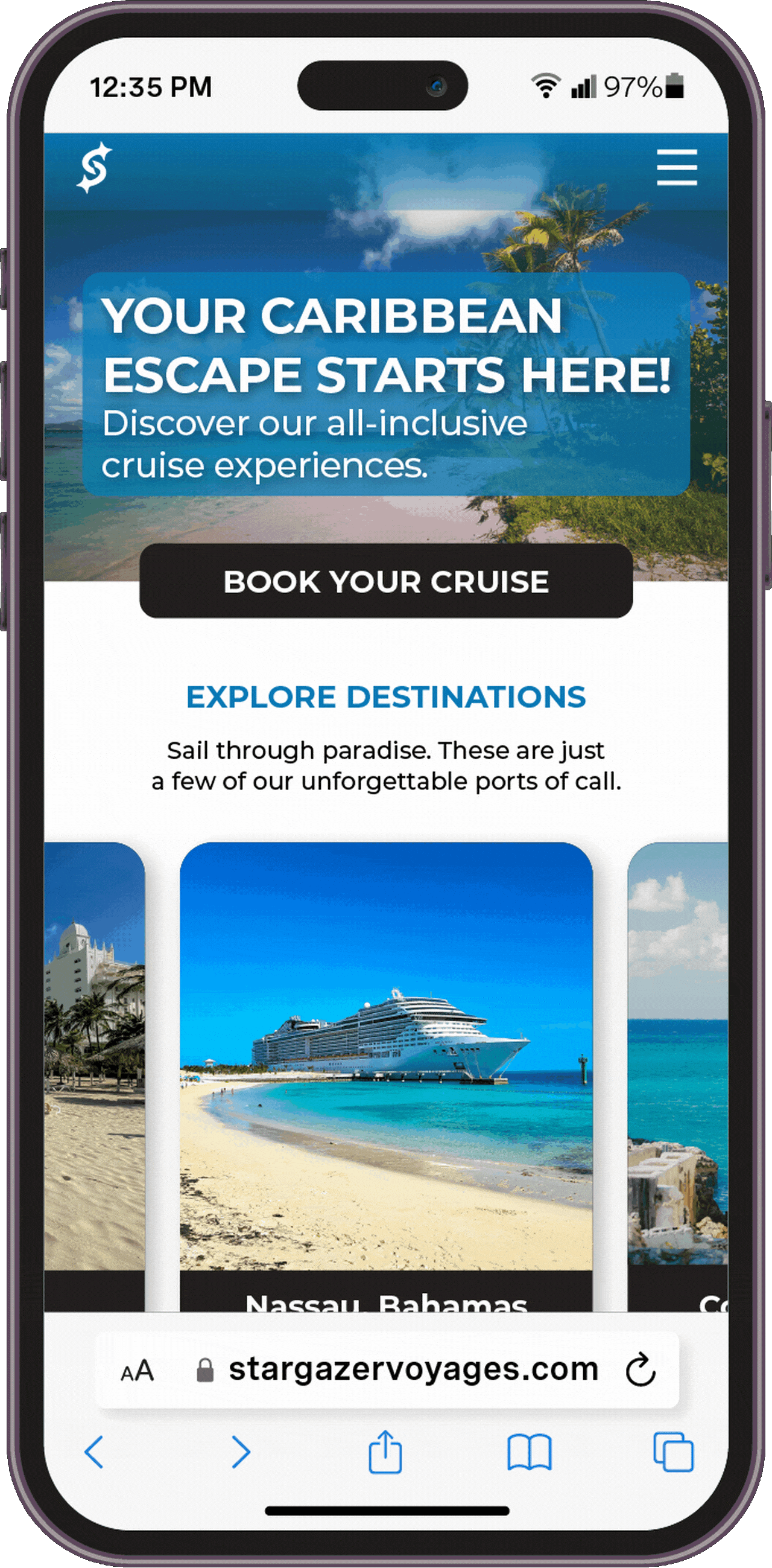 After Dreamforce, Taylor spots a Stargazer Voyages cruise offer at his hotel. A quick QR scan validates his mobile number with Vonage’s Identify Insights API and launches an RCS (Rich Communications Services) journey. Within minutes, Taylor browses trip packages and books his dream cruise.