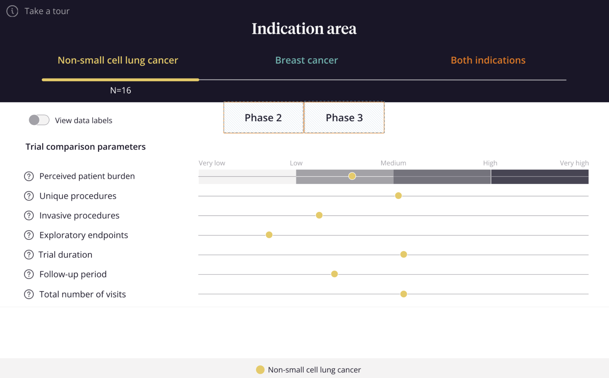 Unique procedures Total number of procedures a patient and site will experience during the life of a trial in the most burdensome arm. Invasive procedures Total number of invasive procedures a patient and site will take part in during a trial in the most burdensome arm. Exploratory endpoints Total number of exploratory endpoints for each trial in the most burdensome arm. Trial duration Per-patient cycle time, in months, from screening visit to final visit in the most burdensome arm. Follow-up period The number of months between the final treatment to the last follow-up visit in the most burdensome arm. Total number of visits The number of visits in the most burdensome arm. Perceived patient burden This ZS and TCSDD-developed metric contextualizes the level of burden patients experience due to procedures during clinical trials, derived from aggregated and averaged feedback from thousands of patients, in the most burdensome arm.